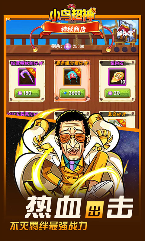 小鸟超神商城特权版是一款由动漫改编的手机游戏。游戏的画面非常漂亮,人物和剧情都非常精彩。其中,有许多熟悉的人物,如草帽团、白胡子、比斯塔、乔兹等等。海量福利非常丰富,q版人物轻松快乐自由。