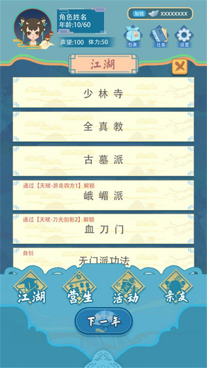 武术生活模拟器应用程序内置修饰符的最新版本是以武术为主题的模拟培训手机游戏。它具有美丽而精美的童话图形设计,更令人兴奋的游戏内容正在等待您解锁!在游戏中,您可以自由选择前往世界的旅程,可以选择成为一个自由骑士,也可以选择参加武术帝国考试。