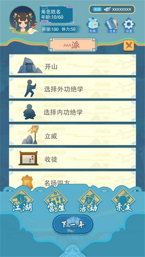 武侠人生模拟器无限勾玉免广告版结合武术主题与模拟人生游戏玩法为玩家带来了新的体验。在武侠人生模拟器无限勾玉免广告版中,玩家可以自由选择自己的业务,通过武术,成为警员或女医生,您可以过上感兴趣的生活。如果您想向大师学习,那么您可以选择许多教派,Shaolin Temple,Quanzhen Sect,Emei Sect等。您可以加入其中的任何一个,这里没有限制。