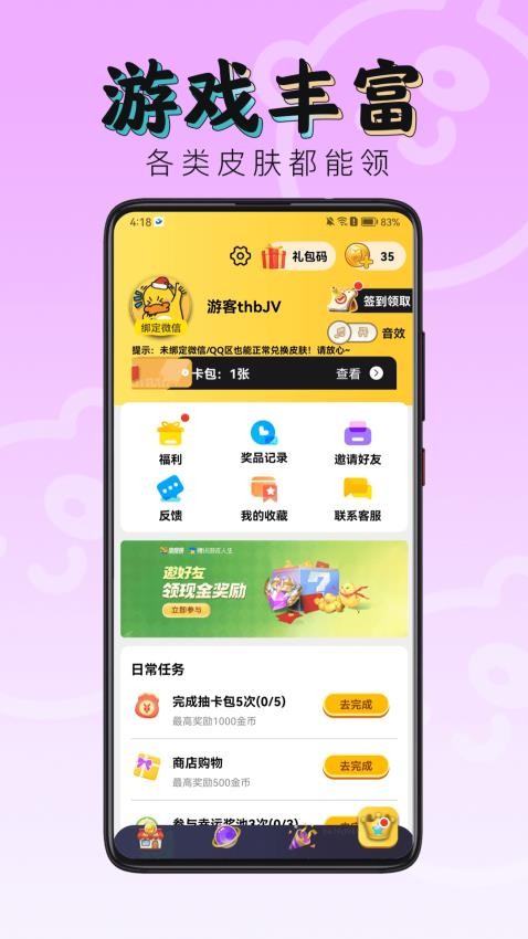 1。完成各种任务,您可以获得金币奖励,并免费兑换您喜欢的游戏皮;