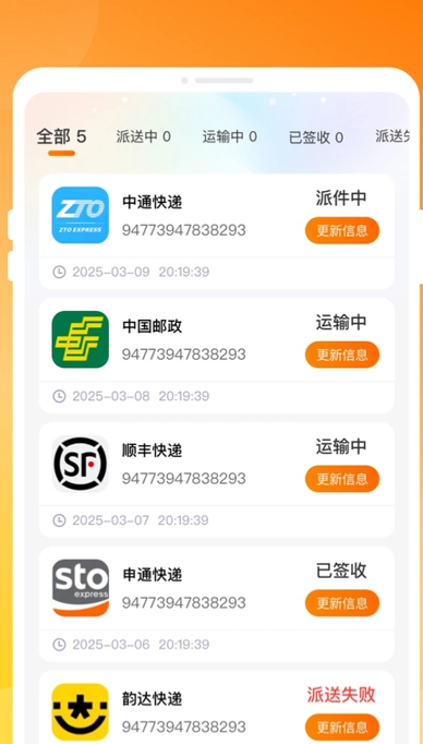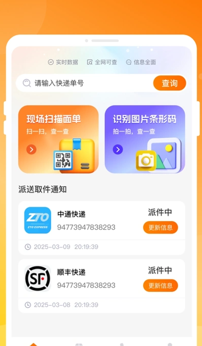 物流快递实时查APP是一键查询应用程序,供用户传递物流信息。当前的物流收集包括国内主流快递公司,例如SF Express,Shentong,ZTO和YTO。用户只需要输入您的手机号码即可查看您的明确订单。该系统将为您提供有关快速交付的全面信息,使您可以随时关注最新消息。
