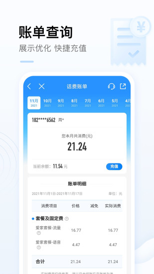 准确而清晰,任何时间,任何地方,以及一站式支持实时电话账单,历史账单,4G流量,点余额,包裹保证金,订阅服务,个人信息和其他查询;