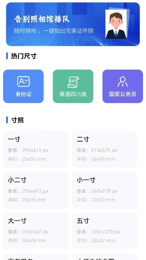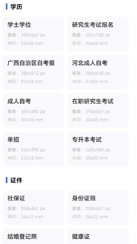 2。收集大量尺寸和规格。您可以直接选择普通的流行尺寸,而无需自己转换。制作ID照片更有效。