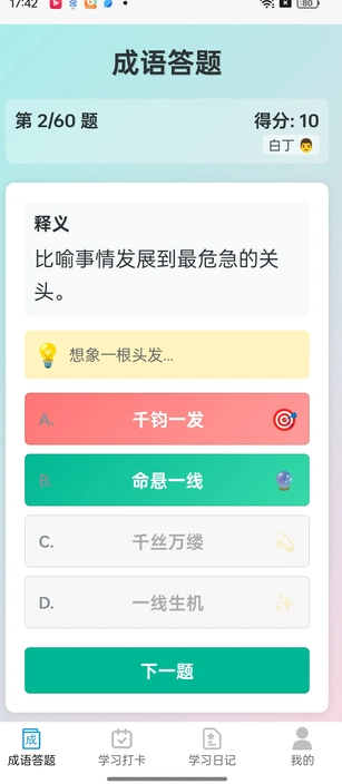 3、让用户每天只需花费少量的时间,随着时间的推移,稳步提高汉语素养,逐步从成语新手成长为成语专家。