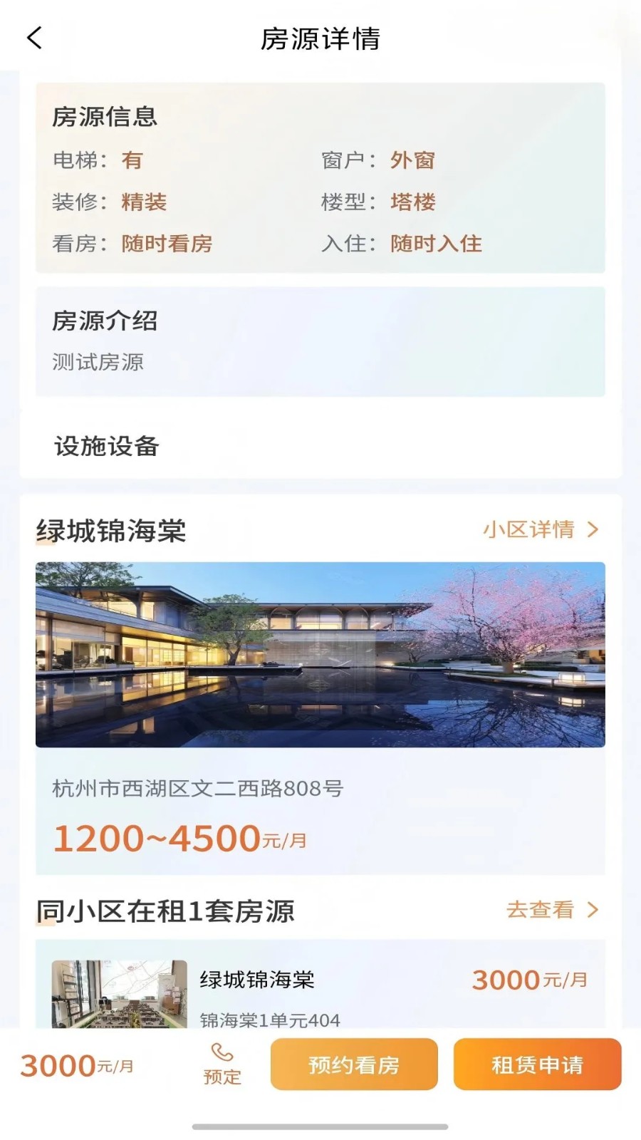 2、在房产详情页面,您可以了解各类房产信息,还可以预约看房、申请出租。