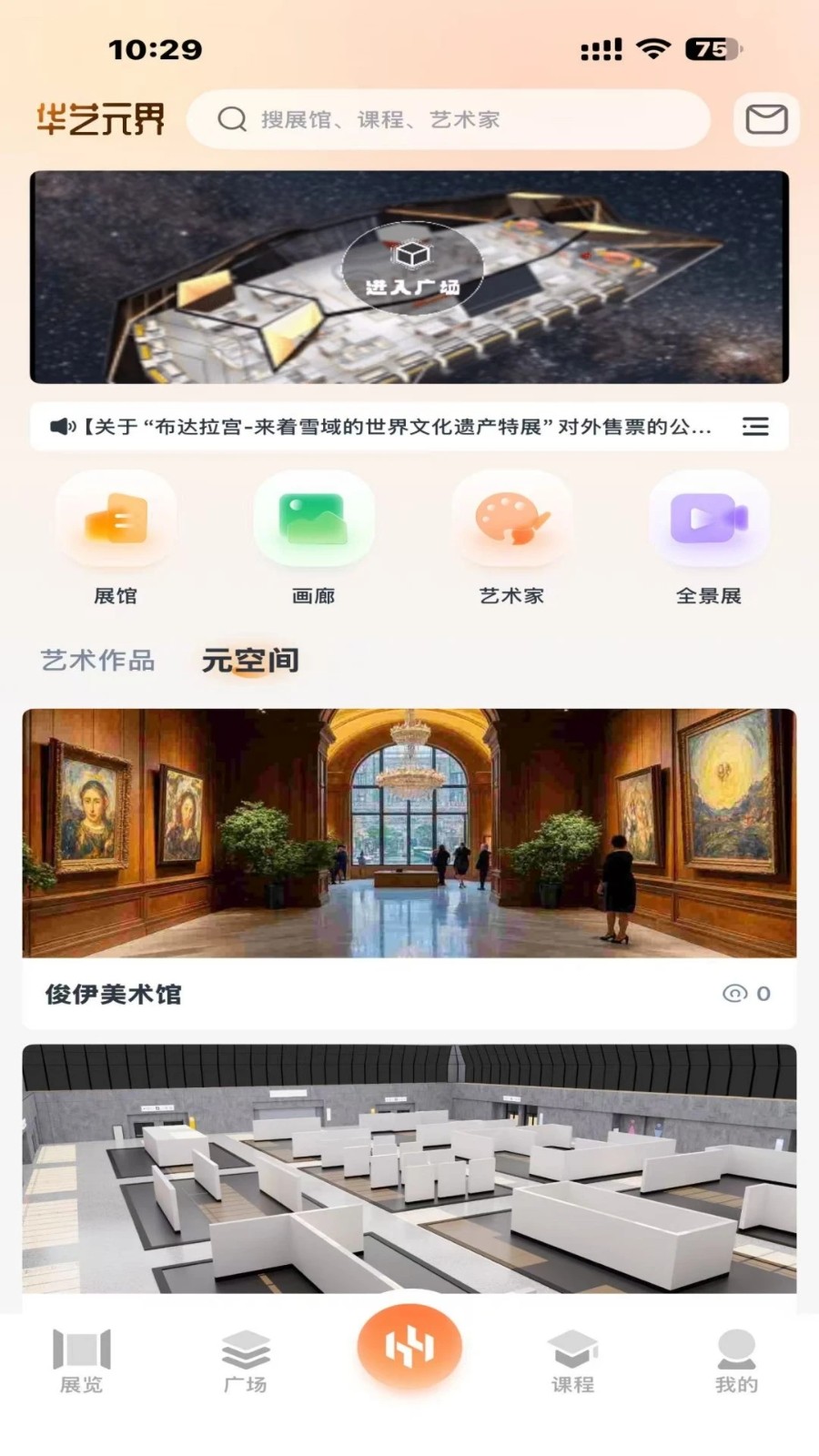 1、首页有展厅、画廊、艺术家、全景展览等分类,以及各类艺术作品;